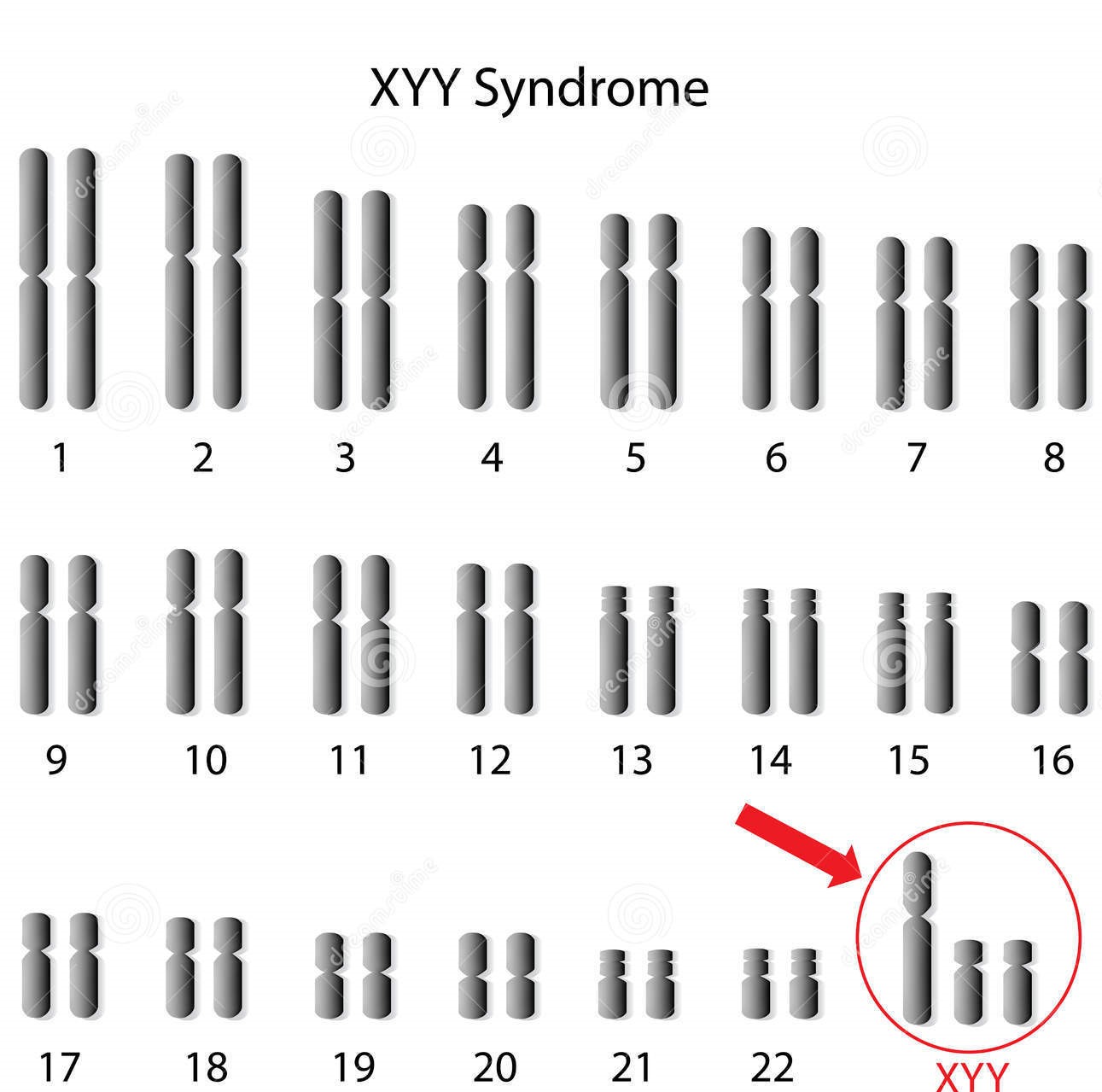 5ª - Síndrome XYY - Anomalia no 23º par de cromossomas, na qual o mesmo é constituído por XY no seu "estado normal", na presença desta anomalia é formado por XYY. É uma síndrome presente exclusivamente em indivíduos do sexo masculino.